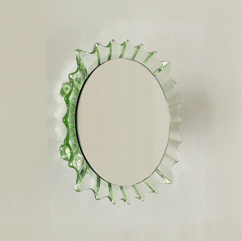Made from vintage glass bowls. Specially developed and tailored construction for each mirror. The glass bowls are directly fixed on the wall, the mirrors are fixed by magnets.